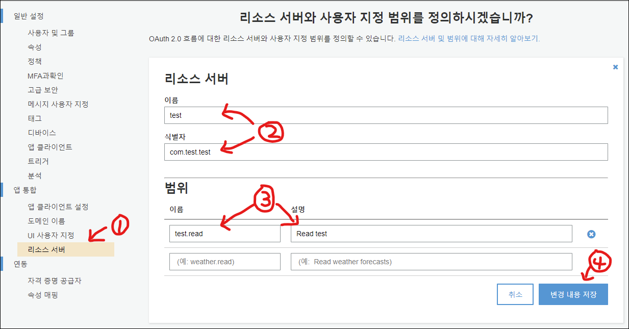 5. Cognito 리소스 서버 추가 및 사용자 지정 범위 지정