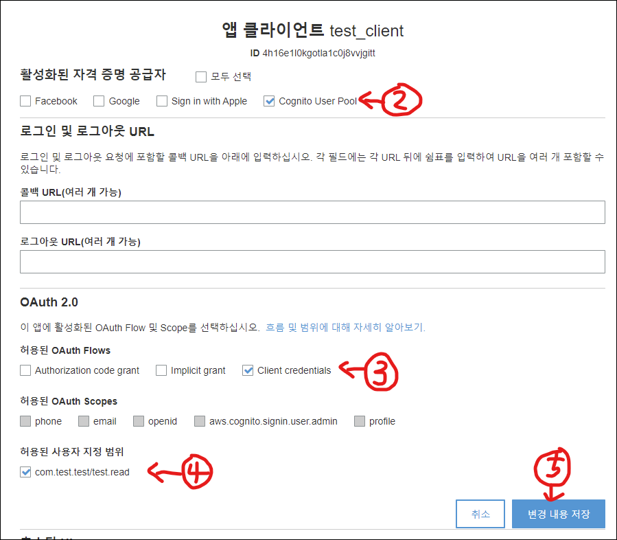 Cognito user Pool을 체크한다. 이 클라이언트 앱은 로그인하지 않는 앱(서버 to 서버)이기 때문에 Client credentials을 체크한다. 그리고 아까 생성한 사용자 지정 범위도 체크하여 저장한다.