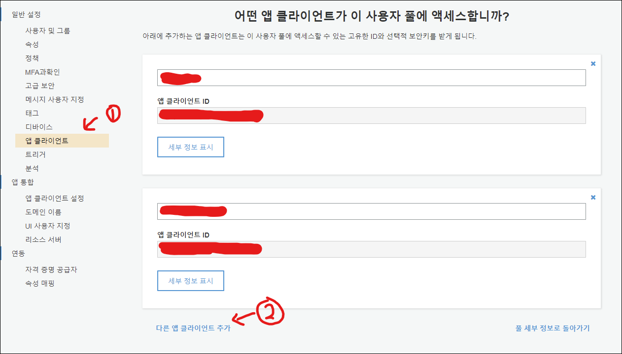Cognito → 사용자 풀 → 특정 사용자 풀 화면에서 아래와 같이 진행한다. 클라이언트 보안키 생성 체크박스에 체크가 돼 있는지 확인한다.